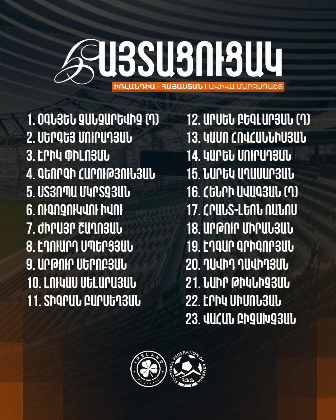 Աշխարհի 2026 թվականի առաջնության ԵՎրոպական գոտու ընտրական փուլի չորրորդ տուրի շրջանակում Հայաստանի ազգային հավաքականը արտագնա խաղում Դուբլինի «Ավիվա» մարզադաշտում ուժերը կչափի Իռլանդիայի ընտրանու հետ: Երեկ կայացած մամուլի ասուլիսում ազգային ընտրանու գլխավոր մարզիչ` Եղիշե Մելիքյանը իր խոսքում նշեց` «Վաղը կտեսնեք պատերազմ: Հոգեբանորեն լավ պատրաստվել ենք»: Իռլանդիա Հայաստան հանդիպումը կմեկնարկի Երևանի ժամանակով ժամը` 22:45-ին: