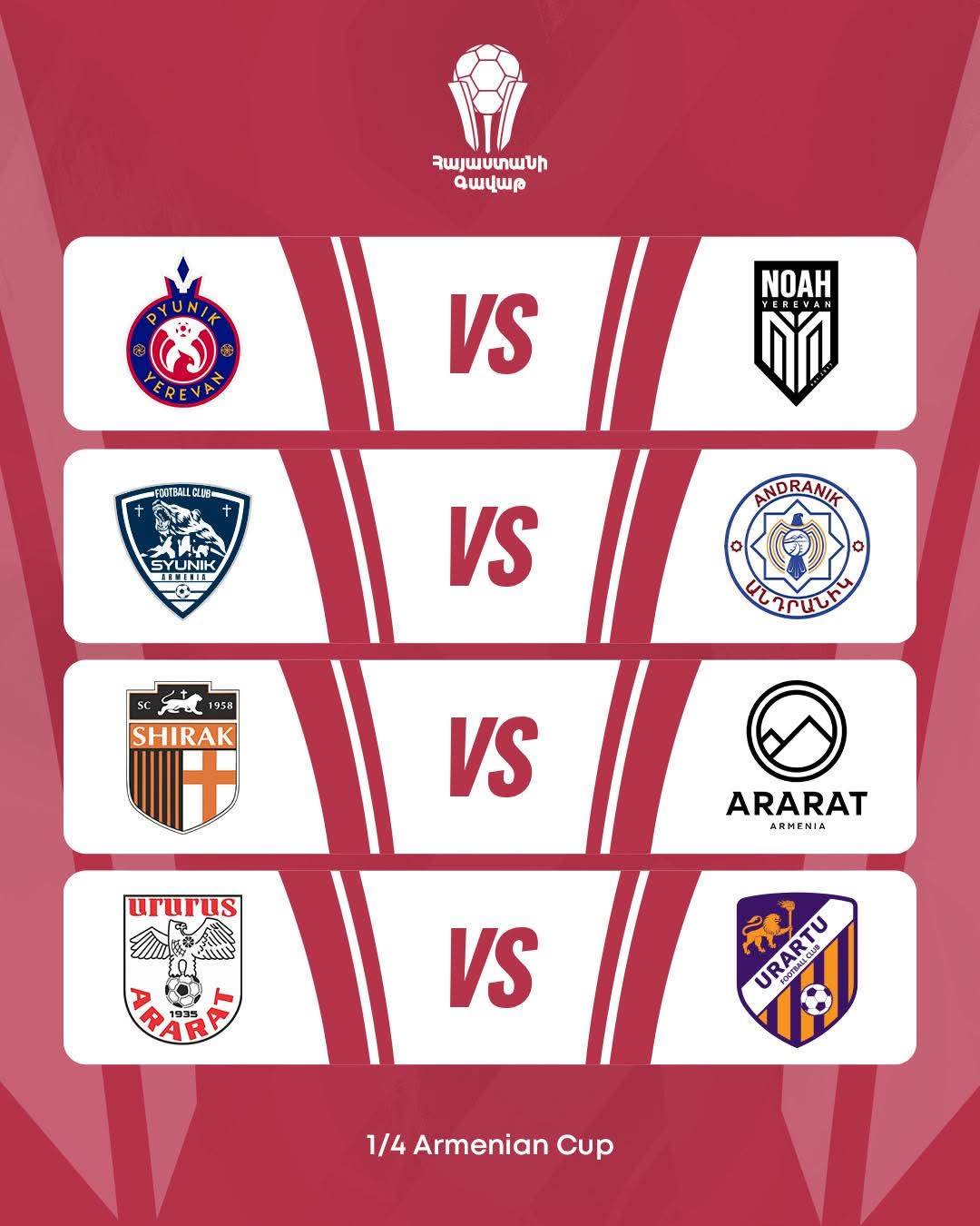 Վիճակահանության արդյուքում այսօր հայտնի դարձավ Հայաստանի գավաթի խաղարկության 1/4 եզրափակչի մրցակից զույգերը։ Այս փուլում պայքարի մեջ կմտնեն Հայաստանի չեմպիոն/գավաթակիր` «Նոա»-ն և նախորդ խաղարկության եզրափակիչ խաղի մասնակից` «Արարատ-Արմենիա»-ն: