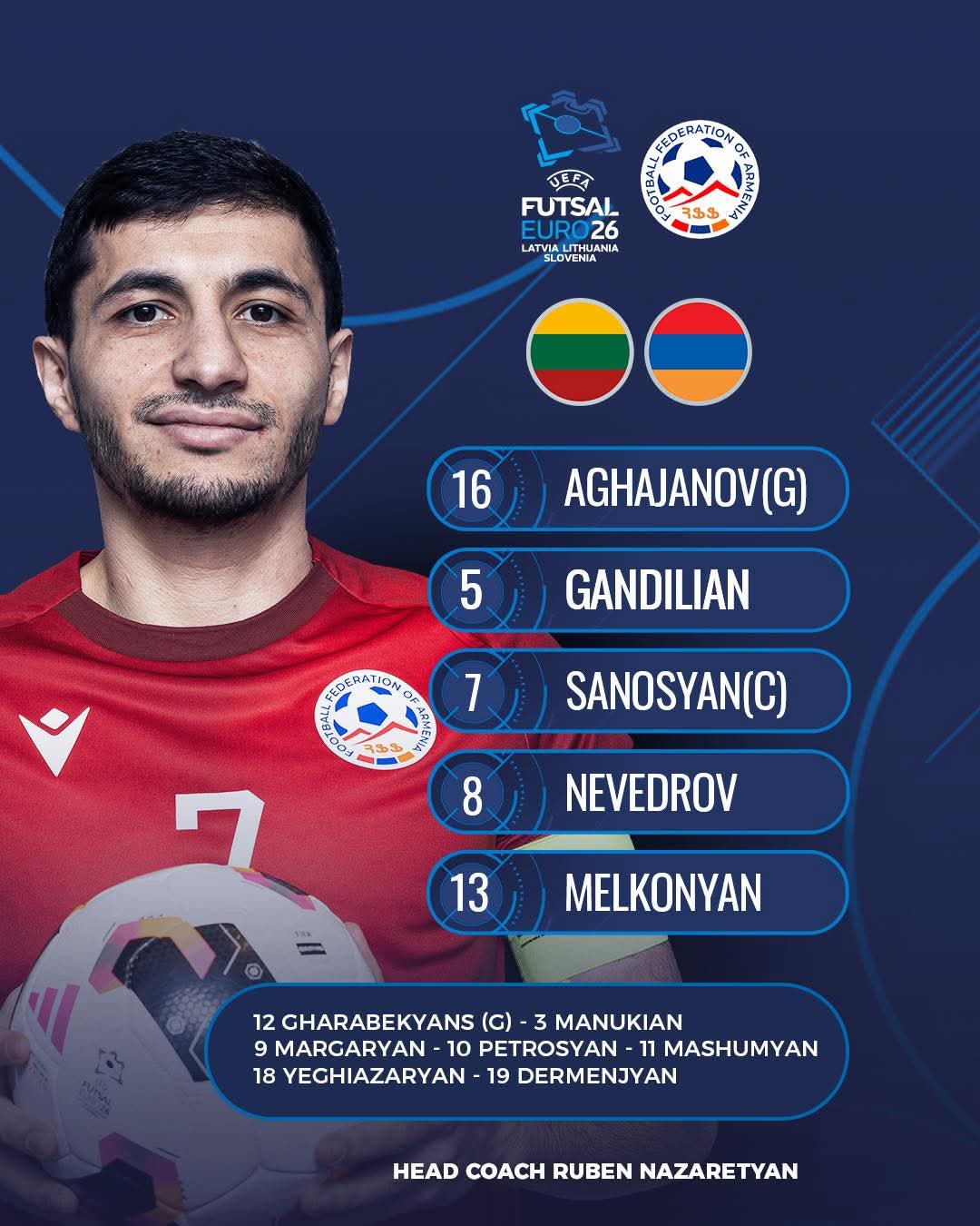 ՀՖՖ-ն հրապարակել է Ֆուտզալի Հայաստանի ազգային հավաքականի մեկնարկային կազմը: Մեր ընտրանին խմբային փուլի վերջին մրցափուլում ուժերը կչափի Լիտվիայի թիմի հետ: Հիշեցնենք Վլադիմիր Սանոսյանը և խաղընկերները գլխավորում են ԵՎՐՈ 2026-Ի B խմբի մրցաշարային աղյուսակը վաստակած վեց միավորով: Հանդիպումը կմեկնարկի Երևանի ժամանակով 22:30-ին: