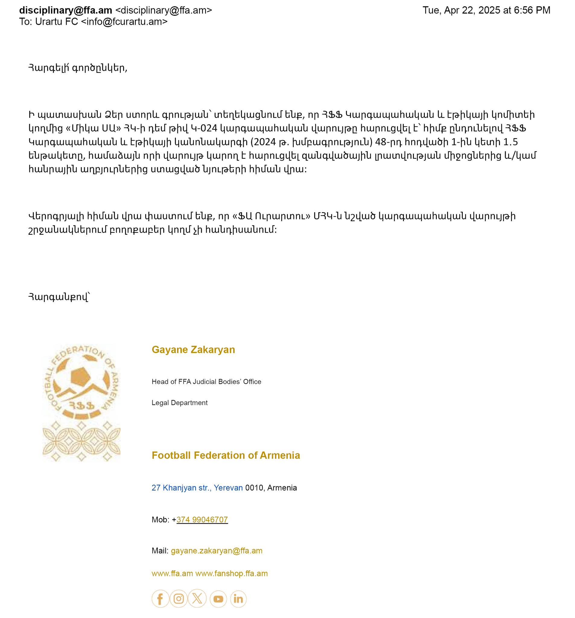 Վերոնշվածը հաստատվում է ՀՖՖ կարգապահական գրասենյակի ղեկավարի կողմից տրված պաշտոնական հավաստմամբ (Կից ներկայացվում է)։